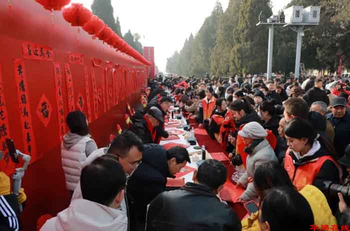 在曲阜万仞宫墙前广场,书法家与优秀青少年书法作者共同挥毫泼墨,为群众书写春联和“福”字。红纸墨香间,书家们以笔墨传递祝福,群众热情参与、有序领取,场面喜庆热烈。